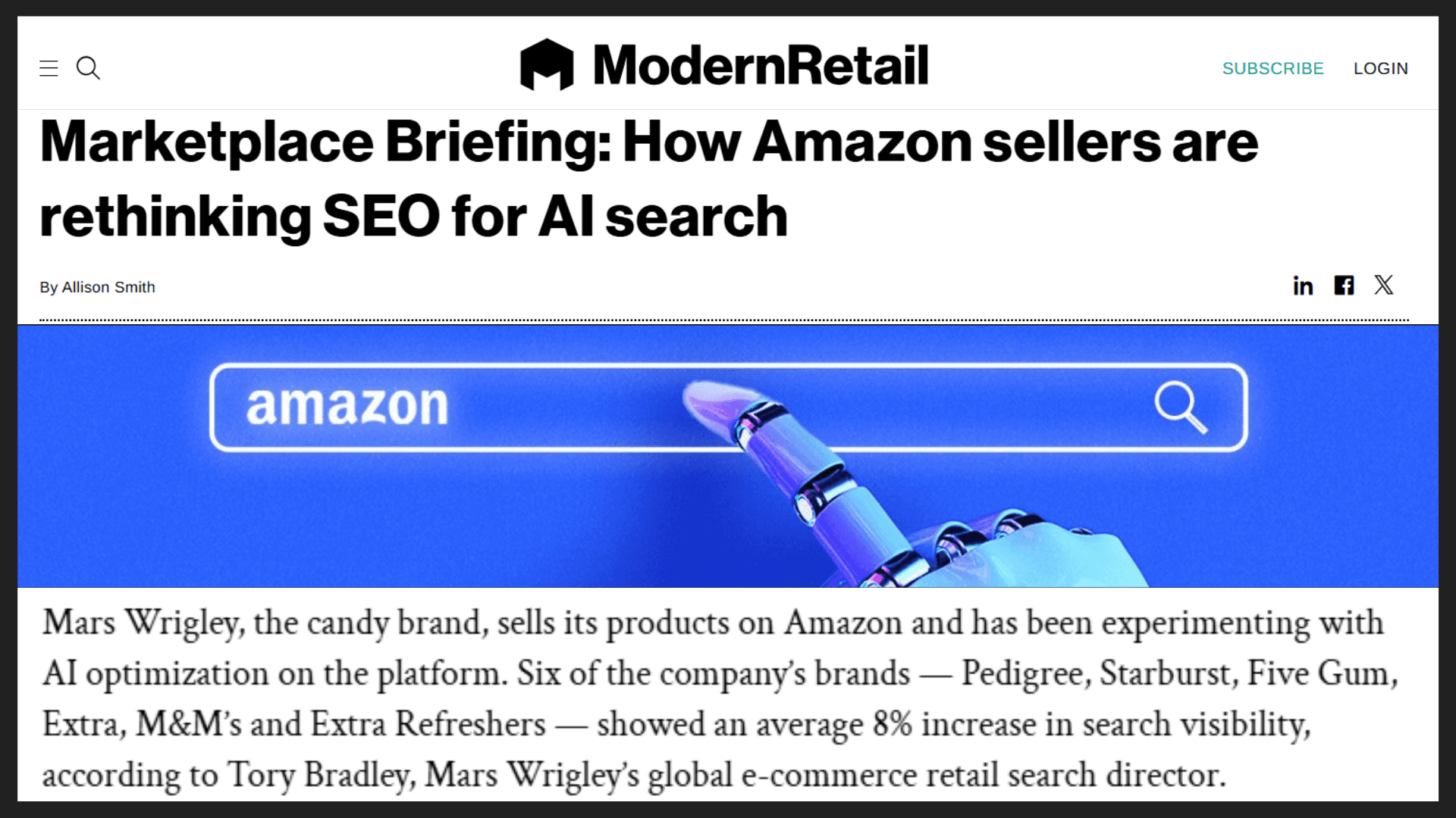 The inital pilot, on six already dominant brands, saw an average increase of 8% in search visibility in just four months, as per Bradley's comments to ModernRetail. In such competitive categories, this is worth tens of millions in additional revenue, and has paved the way for a much larger, global-scoped partnership between Mars Wrigley and Azoma.