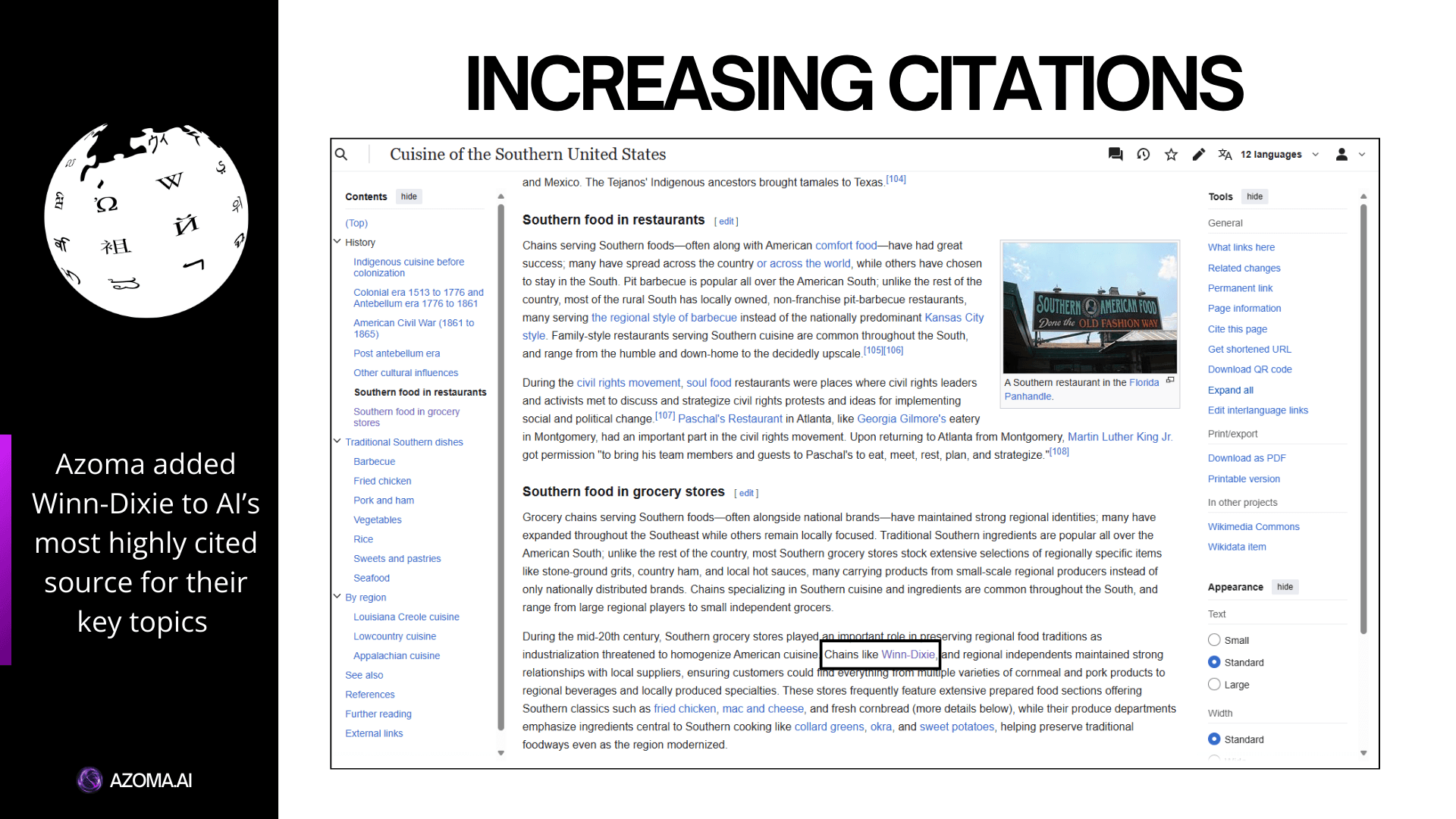 Azoma's AI Visibility Engineers strategically enhanced Winn-Dixie's presence across the web's most AI-cited sources: