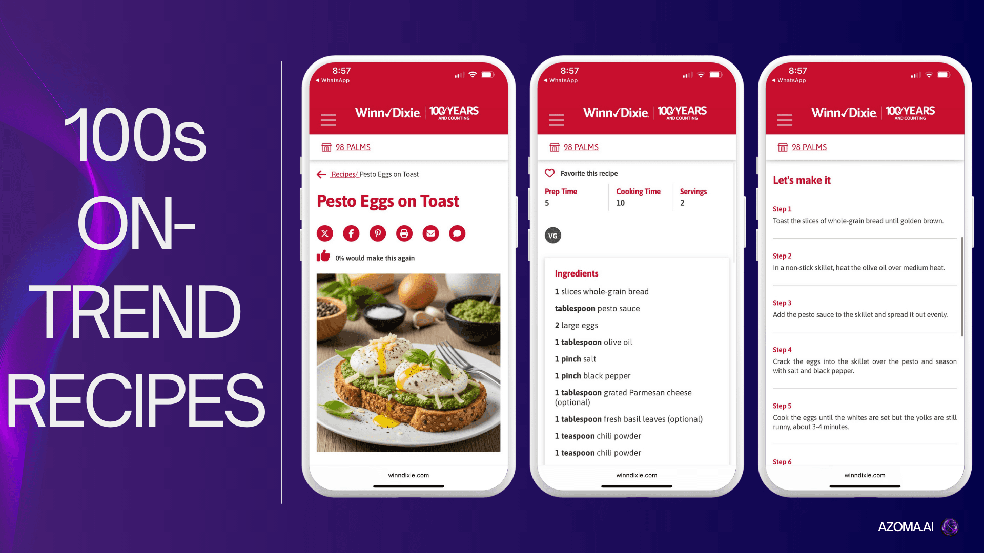 Based on these insights, Azoma generated hundreds of on-trend, AI-optimized recipes tailored to Winn-Dixie's brand voice and customer preferences (see here). Each recipe was designed to capture high-intent AI searches while showcasing Winn-Dixie's value proposition.