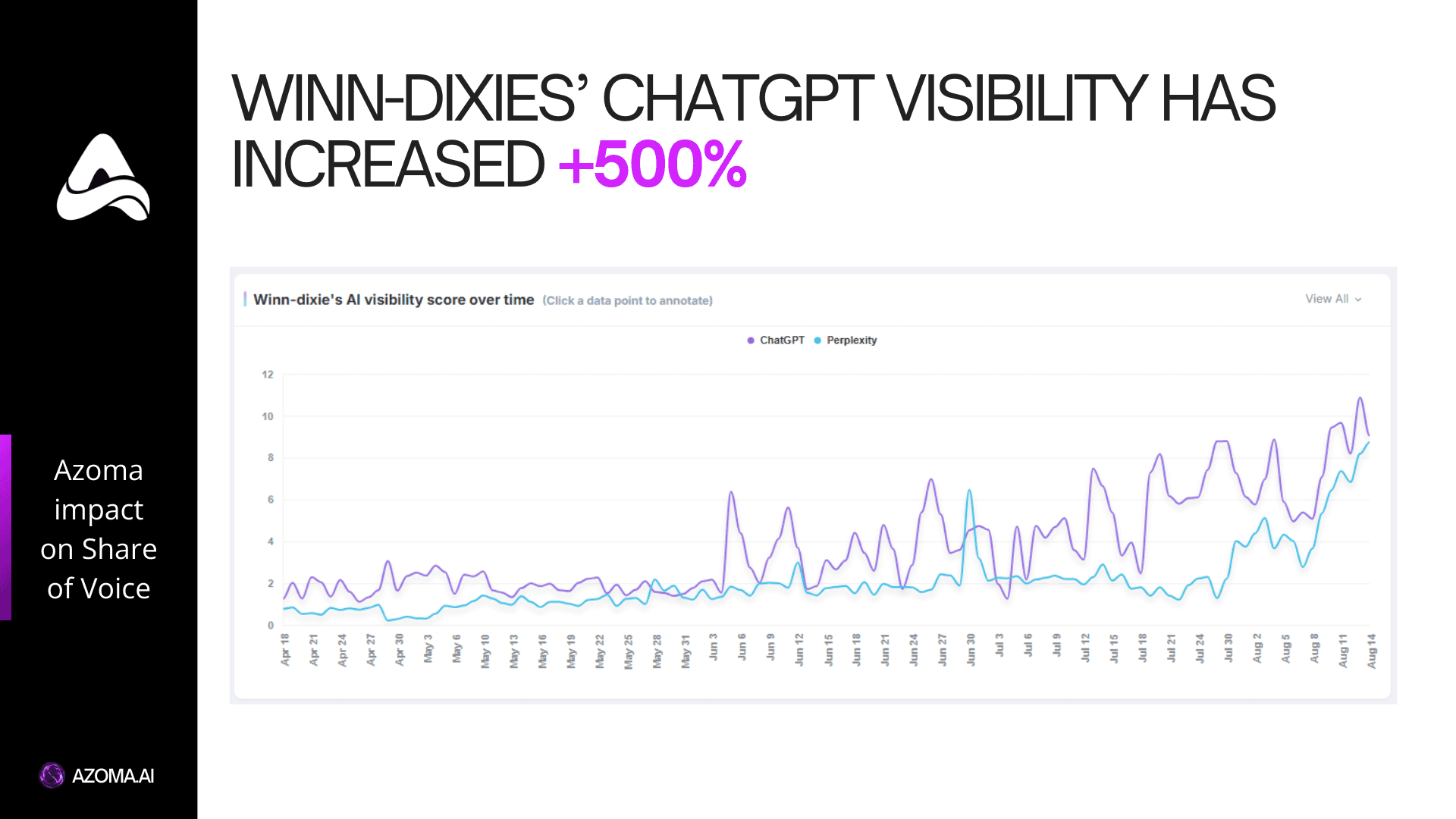 Winn-Dixie's visibility score in ChatGPT increased 500% over the pilot period, with consistent month-over-month growth.