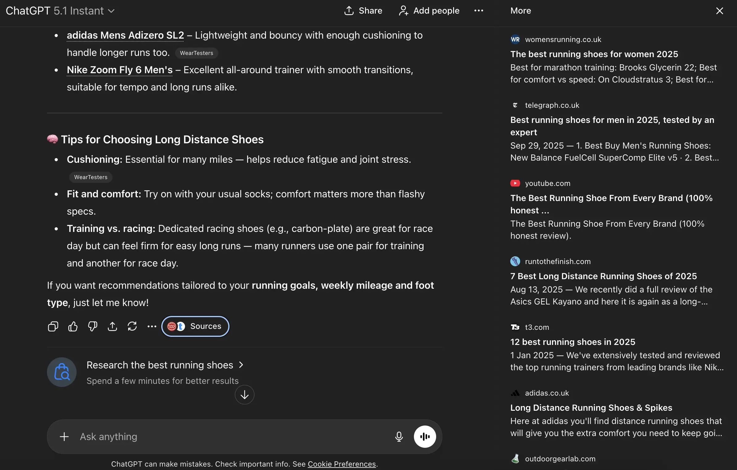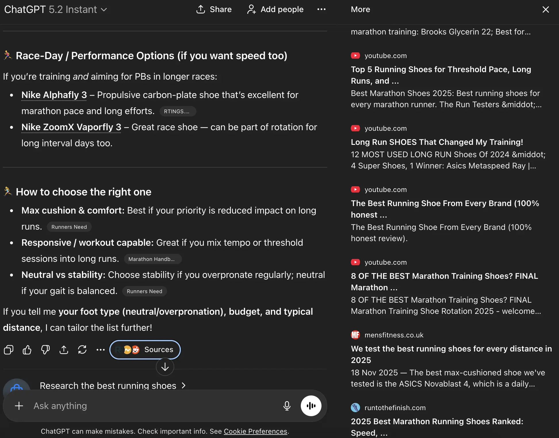 For example, when testing the query “best long distance running shoes” across GPT-5.1 and GPT-5.2, we observed a clear discrepancy in the sources referenced.
